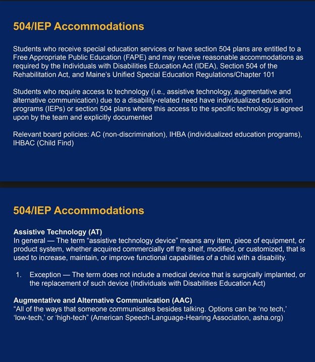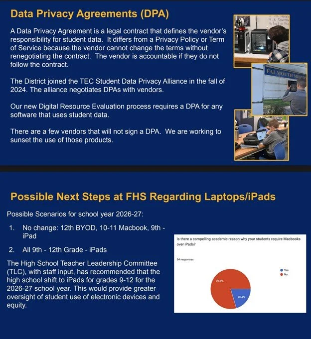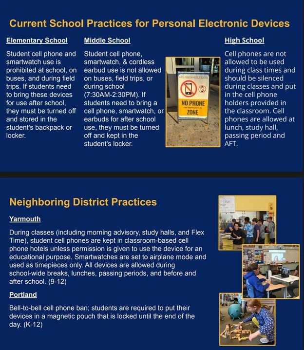 The School Board will be holding a workshop to discuss Student Personal Electronic Devices in Schools (cell phones, watches, airpods) on November 5th at 5:30pm in the high school library. Public comment will be taken and limited to 3 minutes per speaker. The public can also submit written comments to the Board via email at schoolboard@falmouthschools.org.